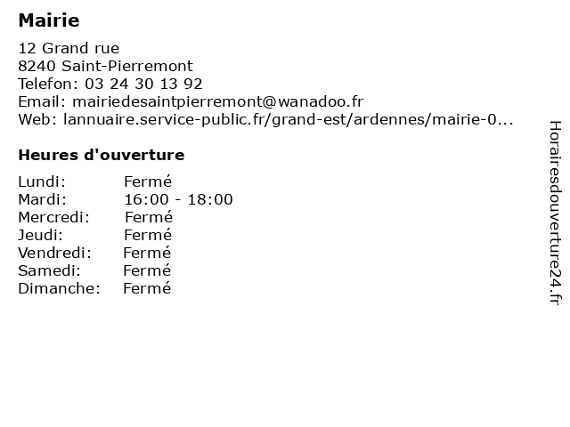 1 Mairie (Distance: 6,47 km) 17 Rue Saint-Pierre, 54122 Fontenoy-la-Joûte administration, mairie, public, service 2 4 6 Mairie (Distance: 18,09 km) 14 Rue des Écoles, 54360 Blainville-Sur-l'Eau administration, mairie, public, service |