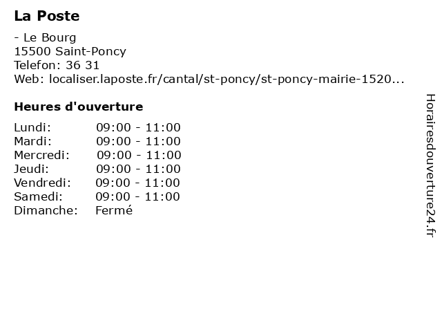 1 La Poste (Distance: 4,29 km) - Le Bourg, 15500 La Chapelle-Laurent agence, assurance, banque, banque postale, bureau de poste, chronopost, colis, courrier, dps, expéditions internationales, la, point, postale, poste, relais, timbres, téléphonie, ups, western union 2 La Poste (Distance: 7,38 km) - Le Bourg, 15170 Ferrières-Saint-Mary agence, assurance, banque, banque postale, bureau de poste, chronopost, colis, courrier, dps, expéditions internationales, la, point, postale, poste, relais, timbres, téléphonie, ups, western union 3 La Poste (Distance: 7,50 km) n/a LE BOURG, 15170 FERRIERES ST MARY colis, courrier, enveloppe, envoi, la, lettres, livraison, paquets, poste, relais colis, timbres 4 La Poste (Distance: 8,98 km) - place Charles de Gaulle, 15500 Molompize agence, assurance, banque, banque postale, bureau de poste, chronopost, colis, courrier, dps, expéditions internationales, la, point, postale, poste, relais, timbres, téléphonie, ups, western union 6 La Poste (Distance: 10,36 km) - Le Bourg, 15100 Vedrines Saint Loup colis, express chronopost, expédition, la, poste, réexpédition internationale, service, suivi du courrier |