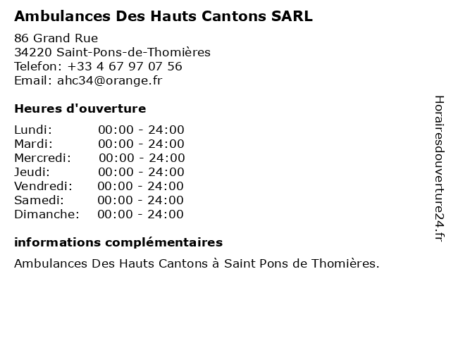 1 Maison de Santé Pluriprofessionnelle des Hauts Cantons (Distance: 0,19 km) 1 Esplanade Du Barry, 34220 Saint Pons de Thomières cantons, de, des, hauts, maison, pluriprofessionnelle, santé 2 ASSISTANCE POMPES FUNEBRES HTS CANTONS (Distance: 0,48 km) 5 Route De Castres, 34220 Saint Pons de Thomières assistance, cantons, funebres, hts, pompes 3 Ambulances du Jaur (Distance: 0,64 km) 47 Avenue de Castres, 34220 Saint-Pons-de-Thomières ambulances, du, jaur 4 Résidence Port Minervois / Les Hauts du Lac*** - Vacancéole (Distance: 24,52 km) Route Du Lac, 11200 Homps du, hauts, lac***, les, minervois, port, résidence, vacancéole 5 Hauts Cantons Rénovation (Distance: 28,76 km) 43 BIS Avenue de Capimont,, 34240 Lamalou-les-Bains cantons, dépannage, hauts, hauts cantons rénovation, rénovation, réseau, électricité 6 Hauts Cantons Sante (Distance: 31,47 km) 15 Avenue De La Republique, 34490 Murviel Les Beziers cantons, hauts, parapharmacie, pharmacie, sante |