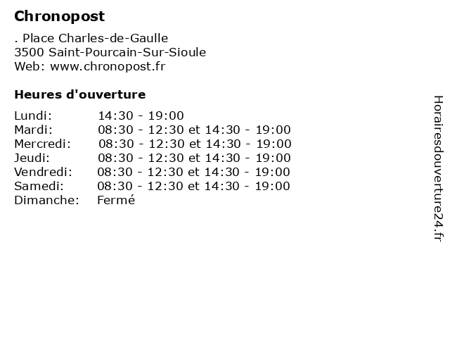 1 Chronopost (Distance: 0,60 km) 13 Rue Mercellin, 03500 Saint-Pourcain-Sur-Sioule chronopost, expédition, livraison, services 2 Chronopost (Distance: 0,75 km) . Place Marechal Foch, 03500 Saint-Pourcain-Sur-Sioule chronopost, expédition, livraison, services 3 Chronopost (Distance: 7,44 km) 90 Avenue de Chazeuil, 03150 Varennes-sur-Allier chronopost, expédition, livraison, services 4 Chronopost (Distance: 8,01 km) 4 Hôtel-de-Ville, 03150 Varennes-sur-Allier chronopost, expédition, livraison, services 5 Chronopost (Distance: 8,15 km) 21 Hôtel-de-Ville, 03150 Varennes-sur-Allier chronopost, expédition, livraison, services 6 Chronopost (Distance: 9,41 km) . Route de Vichy, 03110 St Didier La Foret chronopost, expédition, livraison, services |