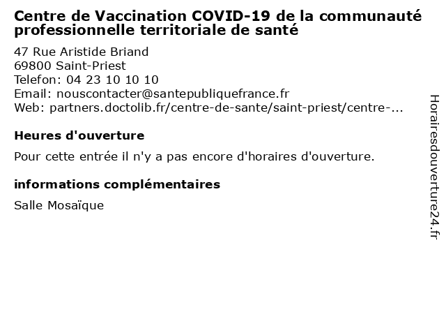 1 Centre de Vaccination COVID-19 de la communauté professionnelle territoriale de santé (Distance: 7,51 km) 2 Rue de la Fraternite, 69740 Genas 19, centre, communauté, covid, covid 19, covid19, de, la, médecin, médecine, médical, professionnelle, santé, territoriale, test, vaccin, vaccination, vaccins 3 Centre de Vaccination COVID-19 (Distance: 3,48 km) 26 Rue du Château, 69200 Vénissieux 19, centre, covid, covid 19, covid19, de, médecin, médecine, médical, test, vaccin, vaccination, vaccins 4 CDHS Centre de Santé et de Prévention (Distance: 3,48 km) 5 place de la Paix, 69200 Vénissieux cdhs, centre, consultation, de, docteur, et, med, médecin, prévention, santé, traitement 5 Ecole de Conduite Française - Horaires d'ouverture pour le service Formation Professionnelle (Distance: 3,49 km) n/a Rue Louis Mouillard, 69500 BRON boat, camper, caravan, conduite, d'ouverture, de, driving license, driving schools, ecole, education, formation, française, horaires, le, motorbike, pour, professional training, professionnelle, recovery points internship, service 6 Centre de Vaccination COVID-19 - Espace Roger Pestourie (Distance: 4,53 km) - Place du 11 Novembre 1918, 69500 Bron 19, centre, covid, covid 19, covid19, de, espace, médecin, médecine, médical, pestourie, roger, test, vaccin, vaccination, vaccins |