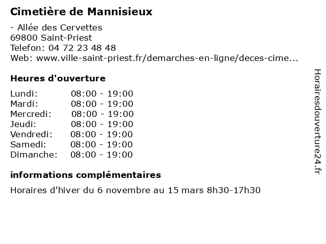 1 Cimetière de l'Égalité (Distance: 2,70 km) 26 rue de l'Égalité, 69800 Saint-Priest cercueil, cimetiere, cimetière, de, deuil, eté, l'égalité, mort 2 Parc cimetière du Grand Lyon (Distance: 5,63 km) 161 Boulevard de l'Université, 69500 Bron arbre, cimetiere, cimetière, crématorium, du, espace vert, forêt, funeraire, grand, jardin, loisirs, lyon, nature, parc, prairie, square 3 Cimetière Communal (Distance: 6,57 km) 87 avenue Ferdinand Buisson, 69500 Bron cercueil, cimetiere, cimetière, communal, deuil, hiver, mort 4 Cimetière Les Tâches (Distance: 7,55 km) 7 avenue de Crottay, 69330 Meyzieu cercueil, cimetiere, cimetière, des, deuil, eté, les, mort, municipal, tâches 5 Cimetière des Brosses (Distance: 7,56 km) 16 Rue Alexandre Dumas, 69120 Vaulx-en-Velin 1er, 30, arbre, au, avril, brosses, cimetiere, cimetière, des, du, espace vert, forêt, funeraire, jardin, loisirs, nature, parc, prairie, septembre, square 6 Ancien Cimetière (Distance: 9,18 km) 1 Rue du Cimetière, 69100 Villeurbanne 1er, ancien, au, caveau, cimetière, du, défunts, funéraire, février, horaires, municipal, novembre, service |