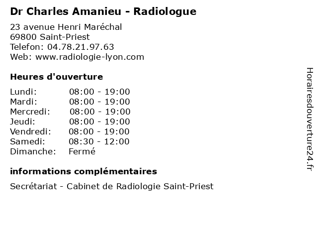 1 Dr Charles Amanieu - Radiologue (Distance: 7,09 km) 24 avenue Paul Santy, 69008 Lyon amanieu, charles, consultation, docteur, dr, med, médecin, médecine, radiologue, traitement 3 Dr Charles Ruimy- Médecin généraliste (Distance: 0,27 km) 3 Rue du Dr Gallavardin, 69800 Saint-Priest charles, consultation, docteur, dr, généraliste, med, médecin, médecine, ruimy, secrétariat, traitement 4 École Primaire Publique Charles Perrault (Distance: 4,45 km) 9 Rue de la Democratie, 69200 Vénissieux charles, cours, education, perrault, primaire, publique, services, école 5 Dr Roger-Charles Luciani - Chirurgien viscéral et digestif (Distance: 5,60 km) 2 Avenue du 11 Novembre 1918, 69200 Vénissieux charles, chirurgien, consultation, digestif, docteur, dr, et, luciani, med, médecin, médecine, roger, secrétariat, traitement, viscéral 6 Pr Charles Patrick Edery - Généticien (Distance: 7,12 km) 59 Boulevard Pinel, 69677 Bron charles, consultation, docteur, edery, généticien, med, médecin, médecine, patrick, pr, traitement |