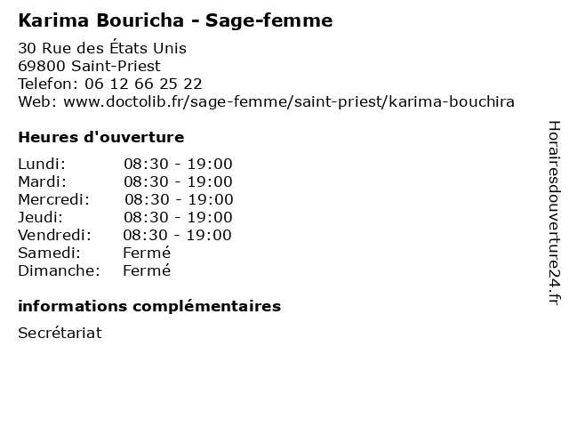 1 Karima Bouricha - Sage-femme (Distance: 0,00 km) 30 Rue des États Unis, 69800 Saint-Priest accouchement, bouricha, echographie, femme, karima, obstétrique, sage, secretariat, secrétariat 2 Dr Karima Bouledrak - Pneumologue (Distance: 5,18 km) 55 avenue Jean Mermoz, 69008 Lyon bouledrak, consultation, docteur, dr, karima, med, médecin, médecine, pneumologue, secrétariat, traitement 3 Dr Karima Nessah-Bousquet - Gynécologue obstétricien (Distance: 5,64 km) 55 Avenue Jean Mermoz, 69008 Lyon bousquet, consultation, docteur, dr, gynécologue, karima, med, médecin, médecine, nessah, obstétricien, secrétariat, traitement 4 Dr Karima Bouledrak - Pneumologue (Distance: 5,64 km) 55 Avenue Jean Mermoz, 69008 Lyon bouledrak, consultation, docteur, dr, karima, med, médecin, médecine, pneumologue, secrétariat, traitement 5 Legmar-Nair Jeanne Karima (Distance: 6,05 km) 257 Route de Vienne, 69200 Vénissieux jeanne, karima, legmar, nair 6 Maître Karima Saidi - Avocate (Distance: 9,63 km) 27 Rue Sala, 69002 Lyon avocate, avocats, cabinet, conseils, contentieux, juridique, justice, karima, litiges, maître, saidi, services |