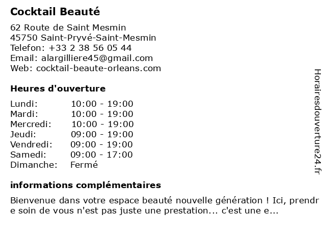 1 Bo Sourire - Centre de Beauté (Distance: 1,95 km) 6 Rue Royale, 45000 Orleans beaute, beauté, bo, centre, de, institut, orleans, produits, sante, sourire 2 Institut Beauté Indienne (Distance: 2,18 km) 282 Rue de Bourgogne, 45000 Orléans beauté, esthétique, indienne, institut, manucure, orléans, salon, spa 3 Thalia Beauté (Distance: 2,30 km) 8 Rue du Général de Gaulle, 45650 Saint-Jean-le-Blanc beaute, beauté, institut, produits, sante, thalia 4 Institut de beauté Wy Nails (Distance: 2,72 km) 3 Rue du 11 Octobre, 45000 Saint-Jean-de-la-Ruelle beauté, construction d'ongles artificiels, de, institut, manucure, nails, ongles, wy 5 Beauté Club (Distance: 3,17 km) 15 Faubourg de Bourgogne, 45000 Orléans beauté, club, coiffeur, coiffure, salon 6 Cocktail Beauté - La Chapelle Saint Mesmin (Distance: 3,23 km) 39 Rue de Bel air, 45380 La Chapelle-Saint-Mesmin beauté, chapelle, cocktail, la, mesmin, saint |