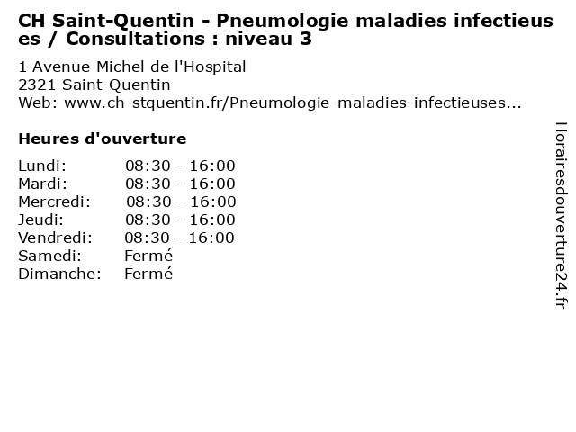 Termes de recherche pour CH Saint-Quentin - Pneumologie maladies infectieuses / Consultations : niveau 3:saint, quentin, bureau, med, medecine, niveau, maladie, ch, traitement, pneumologie, médecin, consultation, dr, consultations, pratique, maladies, therapie, infectieuses |