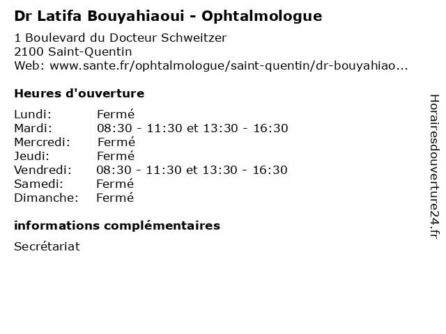 1 Dr Djamal Bouyahiaoui - Néphrologue (Distance: 0,00 km) 1 Boulevard du Dr Schweitzer,, 02100 Saint-Quentin bouyahiaoui, djamal, dr, médecins, médicaments, néphrologue, santé, secrétariat, spécialiste 2 Dr.Latifa Bouyahiaoui- Ophtalmologie (Distance: 2,74 km) 1 Avenue Michel de l'Hospital, 02321 Saint-Quentin bouyahiaoui, consultation, docteur, dr.latifa, ophtalmologie, santé 3 Dr Farah Oumeziane - Ophtalmologue (Distance: 3,09 km) 1 Avenue Michel de l'Hospital, 02100 Saint-Quentin dr, farah, médecins, médicaments, ophtalmologue, oumeziane, santé, secrétariat, spécialiste 4 Dr Hamza Satour - Ophtalmologue (Distance: 3,09 km) 1 Avenue Michel de l'Hospital, 02100 Saint-Quentin dr, hamza, médecins, médicaments, ophtalmologue, santé, satour, secrétariat, spécialiste 5 Dr Issam Chergui - Ophtalmologue (Distance: 3,09 km) 1 Avenue Michel de l'Hospital, 02100 Saint-Quentin chergui, dr, issam, médecins, médicaments, ophtalmologue, santé, secrétariat, spécialiste 6 Dr Abdelkrim Kaaloul - Ophtalmologue (Distance: 3,09 km) 1 Avenue Michel de l'Hospital, 02100 Saint-Quentin abdelkrim, dr, kaaloul, médecins, médicaments, ophtalmologue, santé, secrétariat, spécialiste |