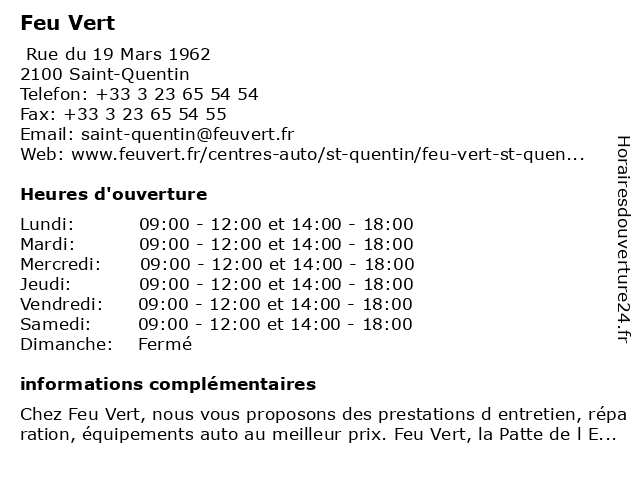 1 Feu Vert (Distance: 17,11 km) Rue de Paris, 80400 Muille-Villette amortisseurs, ampoule, autoradio, batterie, chaussettes neige, chaînes neige, coffre de toit, feu, freinage, glacière, pneu, pneu 4 saisons, pneu hiver, remorque, révision, vert, vidange 2 Pizza Au Feu De Bois (Distance: 0,79 km) 135 Rue Georges Pompidou, 02100 Saint-Quentin au, bois, boissons, collations, de, feu, pizza, restaurants 3 GAMM VERT (Distance: 2,44 km) 21 Rue des Marlettes, 02100 Fayet animalerie, gamm, jardin, jardinerie, mobilier de jardin, plantes, pépinière, vert 4 GAMM VERT (Distance: 4,48 km) 10 Rue Auguste Delaune, 02430 Gauchy animalerie, gamm, jardin, jardinerie, mobilier de jardin, plantes, pépinière, vert 6 |