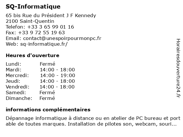 1 DICi Dépannage Installation Conseil informatique (Distance: 0,69 km) 22 Rue d'Alsace, 02100 Saint-Quentin conseil, dici, dépannage, informatique, installation 2 Be-Ware-Informatique (Distance: 1,00 km) 74 Boulevard Henri Martin, 02100 Saint-Quentin be, informatique, ware 3 Jean-Luc Gaulupeau - Artisan Électricien (Distance: 1,07 km) 42 Avenue Faidherbe, 02100 Saint-Quentin artisan, conseil, depannage, electricien, gaulupeau, informatique, jean, les, luc, urgence, Électricien 4 Easy Concept (Distance: 22,43 km) 148 Boulevard Gambetta, 02700 Tergnier concept, dépannage, easy, easy concept, informatique, réparation 5 Point d'Encre (Distance: 35,70 km) 48 Avenue de la Victoire, 58400 Cambrai cartouches & toners, d'encre, fournitures de bureau, informatique et bureautique, papeterie, point, sièges & mobilier de bureau 6 LsmInfo (Distance: 36,33 km) 14 rue du Général de Gaulle, 60400 Noyon informatique, logiciel, lsminfo, magasin, mobile, ordinateur, réparation |