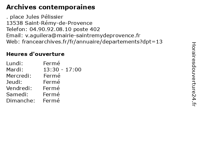 1 Commune de Saint-Rémy-de-Provence - Archives contemporaines (Distance: 0,00 km) - place Jules Pélissier, 13538 Saint-Rémy-de-Provence archives, commune, contemporaines, de, département, départementales, provence, publique, rémy, saint 2 Archives municipales (Distance: 14,08 km) . Place Frédéric Mistral, 13150 Tarascon archives, de ses institutions, des lieux, des événements, municipales, mémoire de la ville 3 Archives municipales (Distance: 15,21 km) . place Georges Clemenceau, 30300 Beaucaire archives, archives departementales, municipales, nationales, regionales 4 Archives municipales (Distance: 17,36 km) . rue du Couvent, 84300 Cavaillon archives, archives departementales, municipales, nationales, regionales 5 Archives municipales (Distance: 17,99 km) 6 rue Saluces, 84000 Avignon archives, archives departementales, municipales, nationales, regionales 6 Archives départementales de Vaucluse (Distance: 18,14 km) . Palais des Papes, 84000 Avignon archives, archives departementales, de, départementales, municipales, nationales, regionales, vaucluse |