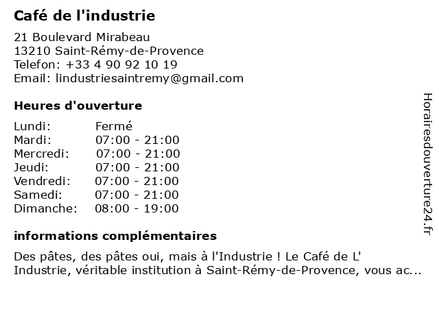1 La Maison du Bon Café (Distance: 0,10 km) 4 Boulevard mirabeau, 13210 Saint-Rémy-de-Provence boissons, bon, boutique, cafe, café, du, la, magasin, maison 2 Le Café de la Place (Distance: 0,34 km) 17 Place de la République, 13210 Saint-Rémy de Provence café, de, français, la, le, place, restaurant 3 Le Baroque Café (Distance: 10,61 km) 21 cours Carnot, 13160 Châteaurenard alcool, baroque, cafe, café, français, le, restaurant 4 L'Agape Café (Distance: 14,22 km) 13 Place du Marché, 13150 Tarascon café, cuisine, français, l'agape, restaurant, restauration 5 La Pause Café (Distance: 15,13 km) 1741 Route de Marseille, 84140 Montfavet beaute, bouygues, cafe, café, chausures, club, enfants, la, mode femmes, mode hommes, pause, restaurant, sport, telecom 6 Café Thiers (Distance: 17,71 km) 12 Rue Thiers, 84000 Avignon bar, boissons, brasserie, café, pub, restauran, thiers |