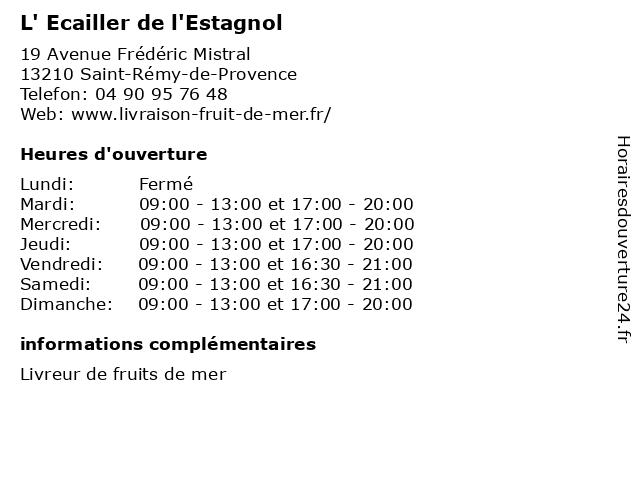 1 L' Estagnol (Distance: 0,32 km) 7 Boulevard Marceau, 13210 Saint-Rémy-de-Provence espagnol, estagnol, l', plats typiques, restaurant, traditionnel 2 Poissonerie Armand (Distance: 20,27 km) 55 Rue Amédée Pichot, 13200 Arles armand, crustacé, poissonerie, poissonneries, sarl 3 Poissonnerie Nature Marée (Distance: 33,62 km) 6 Boulevard Paul Painleve, 13800 Istres crustacé, maree, marée, nature, poissonnerie, poissonneries, poissons 4 C.p.s. 13 (Distance: 42,59 km) Case Postale s 13, 13110 Port De Bouc 13, boucheries, coquillages, poissonneries, poissons 5 CAMARGUE COQUILLAGES (Distance: 46,08 km) Mas de Détroquage, 13230 Port-Saint-Louis-du-Rhône camargue, coquillages, crustacés, mollusques, poisson, poissonnerie, vente de poissons 6 Poissonnerie Le Saint Pierre (Distance: 53,70 km) 53 Cours Taulignan, 84110 Vaison-la-Romaine crevettes, crustacé, de, le, pierre, poissonnerie, poissonneries, saint |