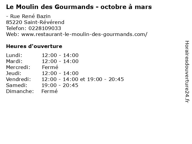 Termes de recherche pour Le Moulin des Gourmands - octobre à mars:restaurant, le, des, alimentation, moulin, mars, brasserie, terrasse, gourmands, octobre, parking |