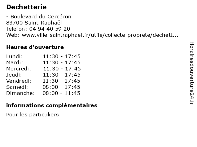 1 Déchèterie (Été) (Distance: 18,25 km) - Route du Muy, 83120 Sainte-Maxime bennes, collecte, déchèterie, gravats, huiles, tri, été 2 Déchèterie (Hiver) (Distance: 18,25 km) - Route du Muy, 83120 Sainte-Maxime bennes, collecte, déchèterie, gravats, hiver, huiles, tri 3 Déchèterie (Distance: 22,01 km) - route des Salins, 83990 Saint-Tropez bennes, collecte, déchèterie, gravats, huiles, tri 4 Déchèterie (Été) (Distance: 26,99 km) - Chemin du Gros Vallat, 83350 Ramatuelle bennes, collecte, déchèterie, gravats, huiles, tri, été 5 Déchèterie (Hiver) (Distance: 26,99 km) - Chemin du Gros Vallat, 83350 Ramatuelle bennes, collecte, déchèterie, gravats, hiver, huiles, tri 6 Courrier (Distance: 27,79 km) . Place René Cassin, 83300 Draguignan courrier, ouverture, récupération des plis postaux, service, tri et distribution |