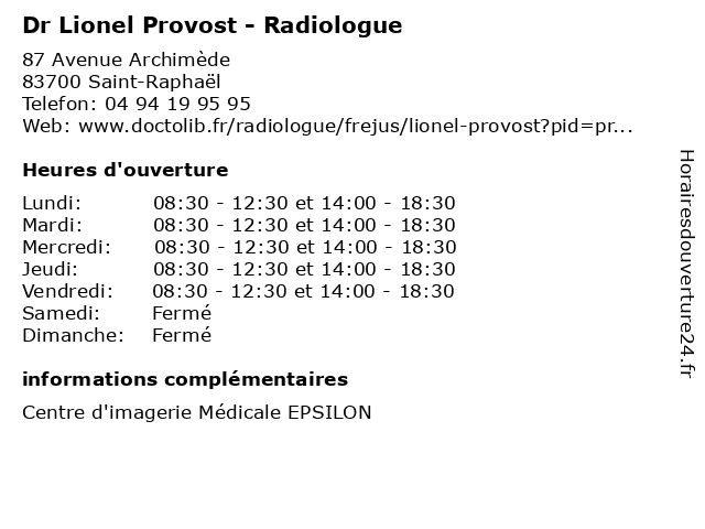 1 Dr Lionel Provost - Radiologue (Distance: 3,01 km) 240 Avenue de Saint-Lambert, 83600 Fréjus dr, lionel, médecin, médecine, médical, pharmaceutique, provost, radiologue, secretariat, traitement 2 Dr Lionel Provost - Radiologue (Distance: 3,38 km) 375 Avenue de Lattre de Tassigny, 83600 Fréjus dr, lionel, médecin, médecine, médical, pharmaceutique, provost, radiologue, secretariat, traitement 3 Franck Provost (Distance: 4,69 km) - Avenue de l'Argens, 83600 Frejus coiffure, franck, provost, salon 4 Coupery Lionel Michel (Distance: 5,53 km) 427 Rue Combattants d Afrique Du n, 83600 Frejus coupery, lionel, michel, restaurants 5 Franck Provost (Distance: 14,21 km) . Route de Frejus, 06210 Mandelieu-la-Napoule beauté, cheveux, coiffure, franck, provost, salon, service 6 Voisin Lionel (Distance: 15,90 km) Villa Pitchoun, 83440 St Paul En Foret lionel, restaurants, voisin |