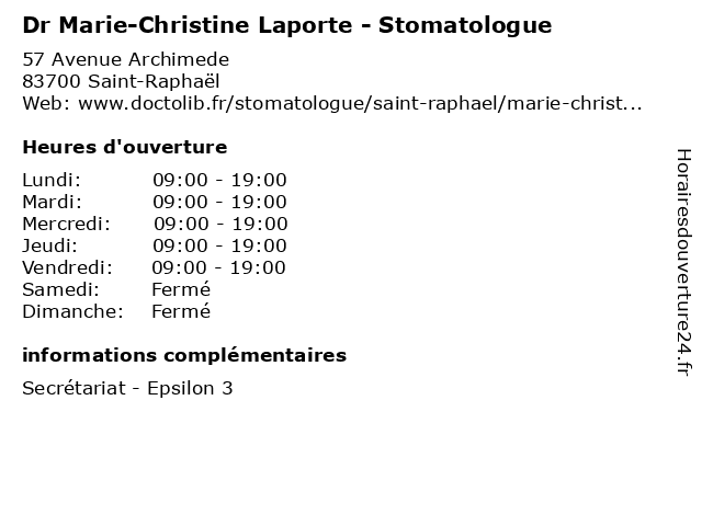 1 Dr Philippe Vermesch - Stomatologue (Distance: 0,00 km) 57 Avenue Archimede, 83700 Saint-Raphaël dr, hématologie, hématologue, immunologique, maladie, philippe, stomatologue, vermesch 2 MEDIDENT Philippe Vermesch - Marie-Christine Laporte SELARL (Distance: 0,02 km) 57 Avenue Archimede, 83700 Saint-Raphaël christine, laporte, marie, medident, philippe, selarl, vermesch 3 Laporte rénovation (Distance: 1,44 km) 308 Avenue Edouard VII, 83700 Saint-Raphaël laporte, rénovation 4 Maître Christine Jeantet - Avocate (Distance: 2,23 km) 194 chemin des Iscles, 83700 Saint-Raphaël avocate, avocats, christine, civils, droits, jeantet, juridiques, maître 5 Dr Christine Tarnau - Chirurgien-dentiste (Distance: 2,98 km) 359 Rue Roland Garros, 83600 Fréjus chirurgien, christine, dent, dentiste, docteur, dr, soins, tarnau 6 Marie-Christine Pardanaud - Sage-femme (Distance: 3,03 km) 240 avenue de Saint-Lambert, 83608 Frejus christine, consultation, docteur, dr, femme, marie, med, médecin, pardanaud, sage, traitement |