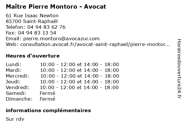 1 Electricité Montoro Eric (Distance: 1,47 km) 849 Boulevard du Cerceron, 83700 Saint-Raphaël chauffage, chauffe eau, climatisation, electricite, electricité, eric, montoro, éclairage extérieur, électricité 2 Dr Borja Montoro Llopis - Médecin généraliste (Distance: 47,24 km) 6 Rue Rossini, 06000 Nice borja, docteur, dr, generaliste, généraliste, llopis, medical, montoro, médecin, soin 3 Maître Eric de Tricaud - Avocat (Distance: 0,00 km) 61 Rue Isaac Newton, 83700 Saint-Raphaël avocat, avocats, civils, de, droits, eric, juridiques, maître, tricaud 4 Maître Géraldine Jeanne - Avocate (Distance: 0,12 km) 205 Rue Isaac Newton, 83700 Saint-Raphaël avocate, avocats, civils, droits, géraldine, jeanne, juridiques, maître 5 Maître Stéphanie Weber - Avocate (Distance: 0,12 km) 205 Rue Isaac Newton, 83700 Saint-Raphaël avocate, avocats, civils, droits, juridiques, maître, stéphanie, weber 6 Romero Julien Jean Pierre Cesario (Distance: 0,43 km) 1733 Boulevard De l Aspe, 83700 Saint Raphael cesario, jean, julien, pierre, restaurants, romero |