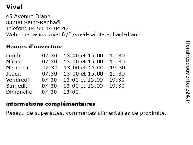 1 Vival (Distance: 3,79 km) 105 Boulevard de la Plage, 83700 Agay droguerie, d’hypermarchés, frais, fruits et légumes, hygiène, parfumerie et autres produits non alimentaires., surgelés, vival, épicerie 2 Vival (Distance: 4,21 km) 120 Avenue Christian Lafon, 83700 Saint Raphael alimentation, distributeur alimentaire, superette, supermarché, vival, épicerie 3 Vival (Distance: 4,71 km) 77 Rue Marius Allongue, 83700 Saint-Raphaël droguerie, d’hypermarchés, frais, fruits et légumes, hygiène, parfumerie et autres produits non alimentaires., surgelés, vival, épicerie 4 Vival (Distance: 6,56 km) 2399 Rue Montourey, 83600 Frejus droguerie, d’hypermarchés, frais, fruits et légumes, hygiène, parfumerie et autres produits non alimentaires., surgelés, vival, épicerie 5 Vival (Distance: 9,10 km) 1900 Route Départementale 4, 83600 Fréjus alimentation, distributeur alimentaire, supermarché, supérette, vival, épicerie 6 Vival (Distance: 9,61 km) 270 Boulevard Salvarelli, 83370 Fréjus supermarché, supérette, vival, épicerie |