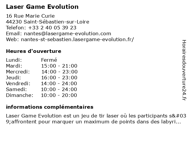 1 Laser Game Evolution (Distance: 0,44 km) 33 Rue marie curie, 44230 Saint sébastien sur loire evolution, game, laser, laser game evolution, saint sebastien sur loire 2 Laser Game Evolution (Distance: 12,39 km) 3 Rue des Piliers de la Chauvinière, 44800 Saint-Herblain evolution, game, laser 3 Laser Game Evolution (Distance: 12,40 km) 3 Rue des piliers de la chauviniere, 44800 Saint herblain evolution, game, laser, laser game evolution, saint herblain 4 Centre Laser d'Esthétique et de Dermatologie Nantais LDN44 (Distance: 0,20 km) 395 Route de Clisson, 44230 Saint-Sébastien-sur-Loire centre, d'esthétique, de, dermatologie, et, laser, ldn44, nantais 5 SOALE LASER MADAME MANUELLA AZEVEDO (Distance: 4,85 km) 35 Boulevard Vincent Gâche, 44200 Nantes azevedo, laser, madame, manuella, soale 6 Laser Karting de Nantes (Distance: 7,27 km) 10 Rue du Marché Commun, 44300 Nantes de, karting, laser, nantes |