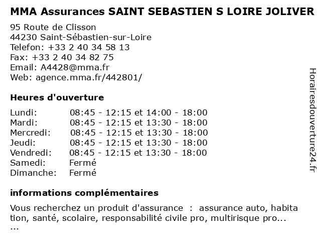 1 MAAF Assurances ST SEBASTIEN (Distance: 0,58 km) 155 Route de Clisson, 44230 Saint-Sébastien-sur-Loire assurance, assurance auto, assurance habitation, assurance moto, assurance professionnelle, assurance prêt immobilier, assurances, crédit auto, maaf, mutuelle, mutuelle santé, sebastien, st 2 GRAND LIEU VOYAGES SAINT SEBASTIEN SUR LOIRE (Distance: 2,12 km) 2 Rue Pierre Mendès France, 44230 Saint-Sébastien-sur-Loire grand, lieu, loire, saint, sebastien, sur, voyages 3 Institut Virginie Beaute St Sebastien Sur Loire (Distance: 2,13 km) 23 Rue Maurice Daniel, 44230 Saint-Sébastien-sur-Loire beaute, institut, loire, sebastien, st, sur, virginie 4 SEPHORA NANTES SAINT SEBASTIEN (Distance: 2,14 km) 2 Rue Pierre Mendès France, 44230 Saint-Sébastien-sur-Loire beauté, carte cadeau, coffret, maquillage, nantes, parfum, parfumerie, saint, sebastien, sephora, soin 5 Opticien NANTES ST SEBASTIEN Générale d'Optique (Distance: 2,15 km) 2 Rue Pierre Mendès France, 44230 Saint-Sébastien-sur-Loire d'optique, générale, magasin de lunettes de soleil, nantes, opticien, sebastien, st 6 Analyse & Action - NANTES / SAINT-SEBASTIEN-SUR-LOIRE (Distance: 2,84 km) 13 Rue Marie Curie, 44230 Saint-Sébastien-sur-Loire action, analyse, loire, nantes, saint, sebastien, sur |