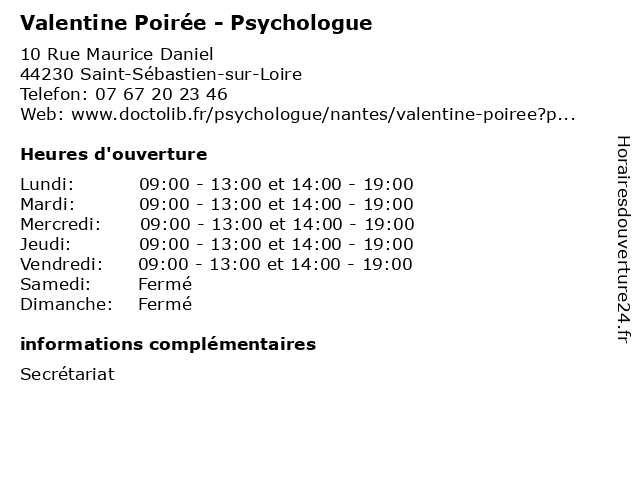1 Valentine Rougeot - Psychologue (Distance: 3,73 km) 12 Rue de la Commune de 1871, 44400 Rezé psy, psychiatre, psychologue, rougeot, sante, soins, valentine 2 Valentine Gur - Ostéopathe (Distance: 4,75 km) 20 Rue des Hauts Pavés, 44000 Nantes gur, osteo, osteopathe, ostéopathe, sante, soins, valentine 3 Dr Valentine Geffriaud-Monty - Chirurgien-dentiste - secrétariat (Distance: 6,31 km) 19 Rue des Renardières, 44100 Nantes chirurgien, consultation, dentiste, docteur, dr, geffriaud, med, monty, secrétariat, valentine 4 Valentine Alteirac - Ostéopathe (Distance: 6,44 km) 1 Avenue des Troenes, 44100 Nantes alteirac, ostéo, ostéopathe, ostéopathes, soins, valentine 5 Valentine Alteirac - Ostéopathe (Distance: 23,01 km) 11 rue des Landes, 44640 Cheix-en-Retz alteirac, ostéo, ostéopathe, ostéopathes, soins, valentine 6 Valentine Friard - Pédicure-podologue (Distance: 59,31 km) 190 Rue de l'Aubépine, 85140 Saint-Martin-des-Noyers friard, pedicure, pied, podologue, pédicure, sante, valentine |