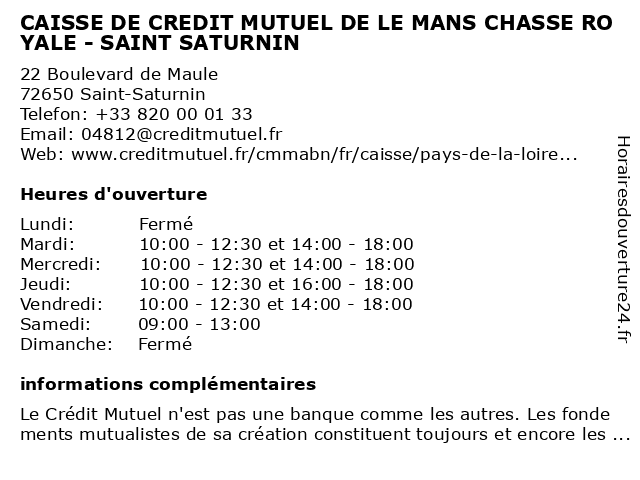 Termes de recherche pour CAISSE DE CREDIT MUTUEL DE LE MANS CHASSE ROYALE - SAINT SATURNIN:le, de, saint, mans, royale, saturnin, crédit, mutuel, caisse, chasse |