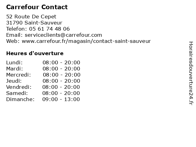 1 Carrefour Contact (Distance: 0,18 km) 52 Route de Cepet, 31150 Saint-Sauveur alimentation, carrefour, contact, magasin discount, market, supermarché 2 Carrefour Contact (Distance: 13,39 km) 22 rue Pasteur, 31700 Blagnac carrefour, contact, convenience stores, festpreisnachlässe, hypermärkte, supermärkte 4 Carrefour Drive (Distance: 0,00 km) 52 Route De Cepet, 31790 Saint-Sauveur alimentaire, carrefour, courses, drive, en ligne, magasin 5 Carrefour Location Contact (Distance: 0,06 km) 52 Route de Cepet, 31790 Saint Sauveur automobiles, carrefour, contact, déménagements, location, véhicules 6 Carrefour Station Service (Distance: 0,14 km) 52 Route de Cepet, 31790 Saint-Sauveur carburant, carrefour, essences, gazole, service, services, station |