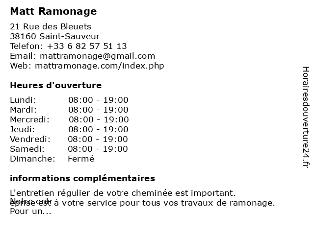 1 Drôme Plomberie Service (Distance: 28,76 km) 850 Allée du Limousin, 26300 Bourg-de-Péage bourg-de-péage, chauffage, climatisation, drôme, plomberie, ramonage, service 2 ERM Ramonage (Distance: 29,80 km) 22 Boulevard Maréchal Foch, 38000 Grenoble chaudière, dégoudronnage, dégraissage hotte, erm, ramonage, tubage cheminée 3 Matt Store Is (Distance: 29,96 km) 24 boulevard Gambetta, 38000 Grenoble is, matt, service, spécialité, store, épicerie, épicerie américaine 4 Sarl Salamandre Ramonage (Distance: 32,30 km) 7 Rue de Chamrousse, 38400 Saint-Martin-d'Hères ramonage, salamandre, sarl 6 |