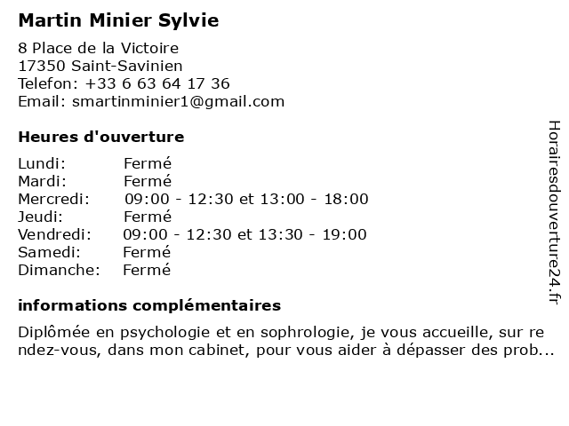 1 Adeline Saint Martin - Sage-femme (Distance: 10,18 km) 64 Rue nationale, 17250 Saint-Porchaire adeline, femme, martin, sage, sagefemme, saint, sante 3 Le Saint-Martin (Distance: 13,05 km) 2 Chemin Du Prieuré, 17400 La Vergne le, martin, repas, restaurants, saint 4 Martin Seb Casse Poids Lourds (Distance: 13,73 km) 19 Route de Nieul, 17250 Soulignonne casse, lourds, martin, poids, seb 5 O Piscines De Martin (Distance: 13,92 km) 6 bis Rue des Plaines, 17810 Saint-Georges-des-Coteaux de, martin, piscines 6 Maître Philippe Minier - Avocat (Distance: 14,28 km) 39 rue Gambetta, 17400 Saint-Jean-d'Angély avocat, avocate, avocats, civils, droits, juridiques, maître, minier, philippe |