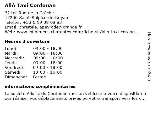 5 Centrale Resa Taxi Royan (Distance: 7,46 km) 2 Rue du Moque Chien, 17570 Saint-Augustin centrale, resa, royan, taxi 6 Le Cordouan (Distance: 7,65 km) 107 Avenue De Pontaillac, 17200 Royan bailleurs, biens, cordouan, immobiliers, nra |