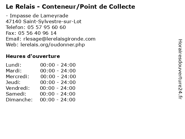 1 Le Relais - Conteneur/Point de Collecte (Distance: 0,15 km) - Rue de Villeneuve, 47140 Saint-Sylvestre-sur-Lot collecte, conteneur/point, de, dons, le, point, relais, vêtements 2 Le Relais - Conteneur/Point de Collecte (Distance: 0,28 km) - chemin des Lauriers, 47140 Saint-Sylvestre-sur-Lot collecte, conteneur/point, de, dons, le, point, relais, vêtements 3 Le Relais - Conteneur/Point de Collecte (Distance: 0,37 km) 5 Impasse de Monflanquin, 47140 Saint-Sylvestre-sur-Lot collecte, conteneur/point, de, dons, le, point, relais, vêtements 4 Le Relais - Conteneur/Point de Collecte (Distance: 0,38 km) 68 Rue de la Republique, 47140 Saint-Sylvestre-sur-Lot collecte, conteneur/point, de, dons, le, point, relais, vêtements 5 Le Relais - Conteneur/Point de Collecte (Distance: 0,63 km) - Route Départementale 911, 47140 Saint-Sylvestre-sur-Lot collecte, conteneur/point, de, dons, le, point, relais, vêtements 6 Le Relais - Conteneur/Point de Collecte (Distance: 0,71 km) - Rue Pasteur, 47140 Saint-Sylvestre-sur-Lot collecte, conteneur/point, de, dons, le, point, relais, vêtements |