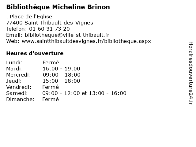 1 Centre Culturel Marc Brinon (Distance: 0,48 km) 1 Rue des Vergers, 77400 Saint-Thibault-des-Vignes activités, brinon, centre, culturel, marc, Évènements 2 Bibliothèque Municipale Annie et Jean Philbert (Distance: 2,24 km) 3 allée de Luzancy, 77400 Pomponne annie, bibliothèque, cd audio, cd.rom, et, jean, livres, municipale, philbert, revues 3 Bibliothèque Du Moustier (Distance: 2,48 km) 1 Ter rue du Moustier, 77400 Thorigny-sur-Marne bibliothèque, cd audio, cd.rom, du, livres, moustier, revues 4 Bibliothèque Gérard Monbilliard (Distance: 6,29 km) . Allée Jean de la Fontaine, 77144 Chalifert bibliothèque, cd audio, cd.rom, gérard, livres, monbilliard, revues 5 Chez Micheline Et Paulette (Distance: 11,49 km) 4 Avenue Grimeler, 77330 Ozoir-la-Ferrière bar, bistro, bistrot, brasserie, café, chez, et, micheline, paulette, pub, restaurant, restauration, resto 6 Bibliothèque Daniel-Renoult (Distance: 15,30 km) 22 Place Le-Morillon, 93100 Montreuil bibliothèque, daniel, publics, renoult, services |