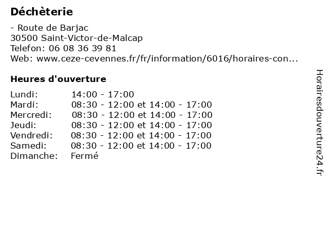 1 Déchèterie (Distance: 8,84 km) - ZI de Conroc, 30160 Bessèges bennes, collecte, déchèterie, gravats, huiles, tri 2 Déchèterie (Distance: 12,18 km) n/c route de Bessas, 30430 Barjac cartons, déchets, déchèterie, gravats 3 Déchèterie (Distance: 12,76 km) - Route de Fons sur Lussan, 30330 Lussan bennes, collecte, déchèterie, gravats, huiles, tri 4 Déchèterie (Distance: 13,63 km) - Champfarnel, 07460 Beaulieu déchèterie, gravats, huiles usées, la réception des déchets et écocentres, les appareils électroménagers, les déchets verts, papier et carton en quantité 5 Déchèterie (Distance: 14,37 km) - ZI l’ Habitarelle, 30110 Les Salles-du-Gardon bennes, collecte, déchèterie, gravats, huiles, tri 6 Déchèterie (Distance: 14,49 km) - Carreau de Saint-Félix, 30520 Saint-Martin-de-Valgalgues bennes, collecte, déchèterie, gravats, huiles, tri |