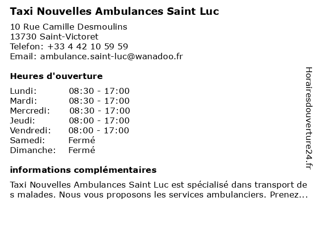 1 Saint-Luc Médical (Distance: 0,28 km) 222 Boulevard Edouard Herriot, 13730 Saint-Victoret luc, medical, médical, parapharmacie, pharmacie, saint 2 Taxi Transport Express Vitrolles (Distance: 2,04 km) 98 Boulevard de l'Europe, 13127 Vitrolles express, taxi, transport, vitrolles 4 Dr Jean-Luc Poet - Rhumatologue (Distance: 2,09 km) 12 bis Avenue Jean Jaurès, 13700 Marignane consultation, docteur, dr, jean, luc, poet, rhumatologie, rhumatologue, santé 5 Dr Jean-Luc Gouiran - Cardiologue (Distance: 2,38 km) - rue Bel Air, 13127 Vitrolles cardiologue, consultation, docteur, dr, gouiran, jean, luc, med, médecin, médecine, traitement 6 Terrassements Issa Jean Luc (Distance: 2,54 km) 383 Allée Jean Blache, 13730 Saint-Victoret issa, jean, luc, terrassements |