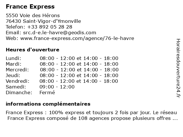 1 France Express (Distance: 0,17 km) . Voie des Hérons, 76430 St Vigor d'Ymonville express, france, poste, services, transporteur 2 France Express (Heures limites de dépôt) (Distance: 0,17 km) . Voie des Hérons, 76430 St Vigor d'Ymonville de, dépôt, express, france, heures, limites, poste, services, transporteur 3 DHL Express (Heure limite de dépôt ) (Distance: 8,56 km) - Rue de la Ferme Dambuc, 76700 Gonfreville L’Ocher de, dhl, dépôt, export, express, heure, import, limite, logistique, mail 4 DHL Express (Distance: 8,56 km) n/a Rue de la Ferme Dambuc, 76700 Gonfreville-l'Orcher courrier, dhl, export, express, import, logistique 5 ESSO EXPRESS CAUCRIAUVILLE SUD (Distance: 11,69 km) 1 AVENUE GÉNÉRAL FERRIE, 76610 Le Havre air tower, caucriauville, esso, express, fuel. gasoline, sud, truck pumps, unleaded, vending machines 6 L'Oriental Express (Distance: 14,71 km) 97 Cours De La Republique, 76600 Le Havre express, oriental, restaurants |