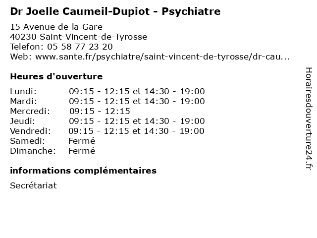 1 Dr Anaïs Baert - Psychiatre (Distance: 1,69 km) 14 Rue de l'Entreprise, 40230 Saint-Vincent-de-Tyrosse anais, anaïs, baert, dr, psy, psychiatre, sante, soins 2 Dr Nicolas Dussere - Psychiatre (Distance: 1,69 km) 14 Rue de l'Entreprise, 40230 Saint-Vincent-de-Tyrosse dr, dussere, nicolas, psy, psychiatre, sante, soins 3 Dr Elodie Vedrenne - Psychiatre (Distance: 10,42 km) 19 Avenue du Maréchal Leclerc, 40140 Soustons dr, elodie, folie, psychiatre, psychiatrie, psychiatrique, vedrenne 4 Auto Moto Ecole Joelle (Distance: 14,27 km) - résidence Saint Martin, 40390 Saint Martin de Seignanx auto, ecole, joelle, moto, permis 5 Auto Moto Ecole Joelle (Distance: 20,98 km) 36 rue Paul Biremont, 64340 Boucau auto, ecole, joelle, moto, permis 6 Dr Joelle Delphino - Anesthésiste (Distance: 21,48 km) 51 boulevard Yves du Manoir, 40107 Dax anesthésie, anesthésiste, anesthésistes, centre, dax, delphino, dr, hospitalier, joelle, réanimateurs, réanimation |