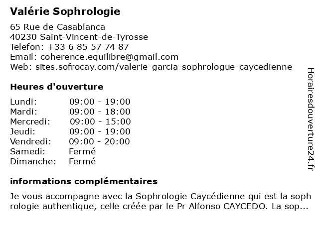 1 Valérie Linacée Bschorr - Hypnothérapeute (Distance: 16,49 km) 110 Impasse de la Gravière, 40300 Orthevielle bschorr, hypno, hypnose, hypnothérapeute, linacée, sante, valérie 2 Valérie Esthéticienne 64 (Distance: 18,57 km) Chemin de Guirauton, 64520 Guiche 64, esthéticienne, valérie 4 Dr Valérie Legrain-Lifermann - Dermatologue et vénérologue (Distance: 19,14 km) 51 boulevard Yves du Manoir, 40107 Dax centre, dax, dermatologue, dr, et, générale, hospitalier, interne, legrain, lifermann, maladie, médecin, valérie, vénérologue 5 Dr Valérie Poncin - Ophtalmologue (Distance: 19,14 km) 51 boulevard Yves du Manoir, 40107 Dax centre, dax, dr, hospitalier, ophtalmologie, ophtalmologistes, ophtalmologue, poncin, valérie, vision 6 Corinne Garrabos - Yoga (Distance: 0,20 km) 205 avenue de Terreblanque, 40230 Saint Vincent de Tyrosse corinne, corinne garrabos etche yoga, cours de yoga, etche, garrabos, réflexologie, sophrologie, yoga |