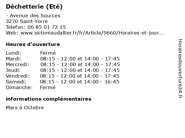 | Termes de recherche pour Déchetterie (Eté):de, saint, au, mars, 1er, 31, été, octobre, yorre, dechetterie, ordures |