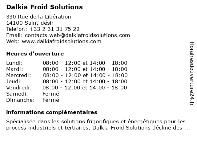 1 Saint-Gobain Verre Solutions (Distance: 6,60 km) 111 Rue René Barthélémy, 14100 Lisieux gobain, saint, solutions, verre 3 Le Froid Pecomark (Distance: 34,34 km) 15 rue des Frères Chappe, 14540 Grentheville fournisseurs, froid, industriel, le, pecomark, équipements 4 GFF - Générale Frigorifique France (Distance: 34,69 km) 17 rue Daguerre, 14120 Mondeville fournisseurs, france, frigorifique, froid, gff, générale, industriel, équipements 5 Froid Laverie Services (Distance: 37,82 km) 45 Boulevard de Graville, 76600 Le Havre froid, laverie, services 6 Dalkia Froid Solutions (Distance: 40,45 km) 30 Delle du Poirier, 14320 Saint-André-sur-Orne dalkia, froid, solutions |