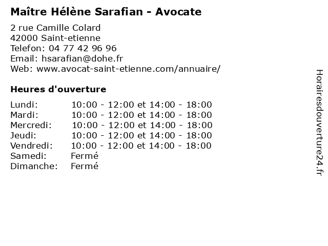 1 Maître Hélène Sarafian - Avocate (Distance: 0,02 km) 2 rue Camille Colard, 42000 Saint Etienne avocat, avocate, avocats, civils, droits, hélène, juridiques, maître, sarafian 2 Maître Hélène Chabrier - Avocate (Distance: 0,24 km) 20 rue Michel Ronde, 42000 Saint-Étienne avocate, avocats, chabrier, civils, droits, hélène, juridiques, maître 5 Dr Hélène Flandin - Médecin généraliste (Distance: 2,13 km) 154 bis Cours Fauriel, 42100 Saint-Étienne consultation, docteur, dr, flandin, généraliste, hélène, med, médecin, traitement 6  |
