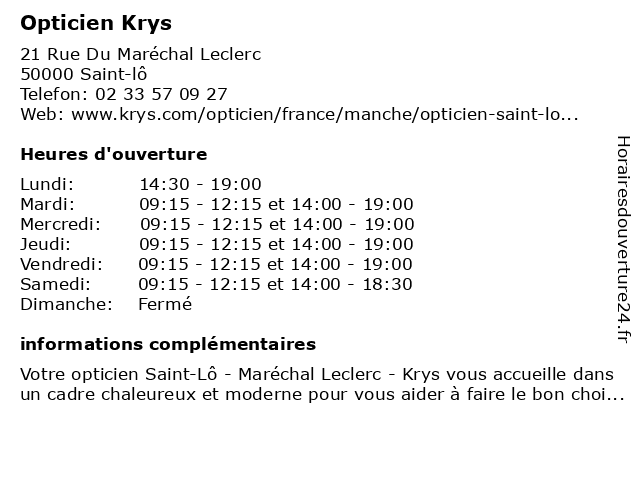 | Mercredi | 09:15-12:15 et 14:00-19:00 |