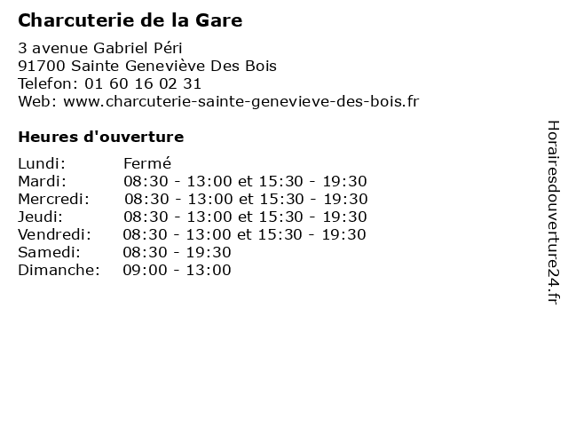 1 Marché de la Gare à Sainte-Geneviève-des-Bois (Distance: 0,06 km) - Place Franklin Roosevelt, 91700 Sainte-Geneviève-des-Bois bois, de, des, frutas, gare, geneviève, hortalizas, la, marché, mercado, sainte, verduras 2 Pharmacie de la Gare de Sainte Geneviève (Distance: 0,06 km) 3 Place du Président Franklin Roosevelt, 91700 Sainte-Geneviève-des-Bois de, gare, geneviève, la, pharmacie, sainte 3 Centre Médical de la Gare (secrétariat ) (Distance: 3,73 km) 2 Avenue Charles de Gaulle, 91600 Savigny-sur-Orge centre, consultation, de, docteur, gare, la, médecins, médical, santé, secrétariat 4 Cabinet Médical de la Gare - Médecine générale (secrétariat ) (Distance: 9,50 km) 3 Avenue du Président Robert Lakota, 91270 Vigneux sur Seine cabinet, consultation, de, docteur, gare, générale, la, médecine, médical, santé, secrétariat 5 Cabinet médical de la gare (secrétariat ) (Distance: 10,46 km) 6 Avenue de la gare, 91520 Egmy cabinet, consultation, de, docteur, gare, la, médecins, médical, santé, secrétariat 6 Onepark / Gare SNCF Parking (Distance: 17,16 km) - Rue des Bergeries, 77380 Combs-la-Ville gare, onepark, parking, services, sncf |