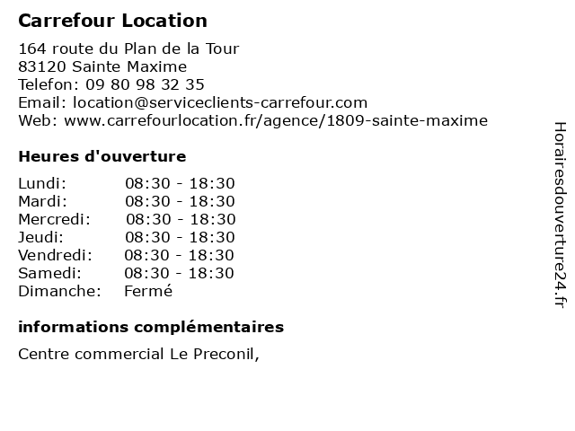1 Carrefour Location (Distance: 8,64 km) - Lieu Dit Font Mourier, 83310 Cogolin agence, carrefour, location, utilitaires, véhicules 2 Carrefour Location (Distance: 15,55 km) - Route Nationale 7, 83480 Puget sur Argens alimentation, carrefour, location, magasin discount, market, supermarché 3 Carrefour Drive (Distance: 0,00 km) 164 Route Du Plan De La Tour, 83120 Sainte-Maxime alimentaire, carrefour, courses, drive, en ligne, magasin 4 Carrefour (Distance: 0,08 km) 164 route du Plan de la Tour, 83120 Sainte-Maxime carrefour, le maxidiscompte, les marchés, les supermarchés, magasins de proximité 5 Pharmacie Carrefour de l 'Europe (Distance: 0,14 km) - Route du Muy, 83120 Ste Maxime 'europe, carrefour, coutiere, de, europe, lambrou, li, parapharmacie, pharmacie, polverel 6 Le Groupe Carrefour - Car Park (Distance: 12,33 km) . Ramatuelle, 84097 Avignon automobile, car, carrefour, groupe, le, park, parking, services |