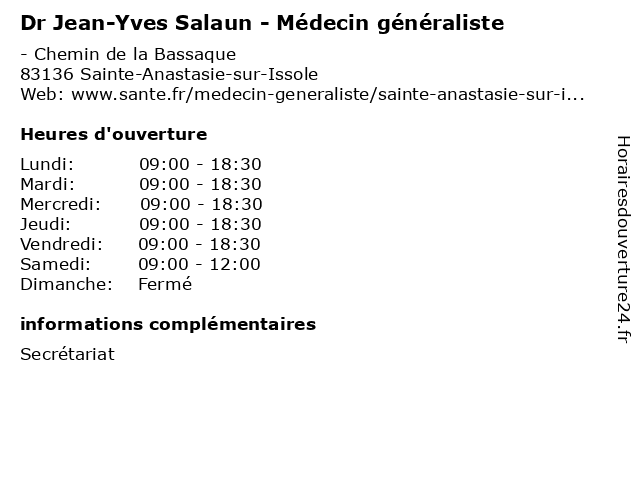 2 Medecin Yves Pirollet (Médecin généraliste) (Distance: 8,78 km) 48 Rue de la Republique, 83170 Brignoles docteur, généraliste, medecin, médecin, pirollet, sante, services, yves 4 Dr Erwan Salaun - Cardiologue (Distance: 58,05 km) 264 Rue Saint-Pierre, 13005 Marseille cardiologue, consultation, docteur, dr, erwan, med, medecine, medical, médecin, salaun, traitement 5 Dr Gwenael Salaun - Médecin généraliste (Distance: 58,05 km) 264 Rue Saint-Pierre, 13005 Marseille consultation, docteur, dr, gwenael, généraliste, med, médecin, salaun, traitement 6 Gibely Jean-Louis (Distance: 0,01 km) 15 Chemin de la Bassaque, 83136 Sainte-Anastasie-sur-Issole gibely, jean, louis |