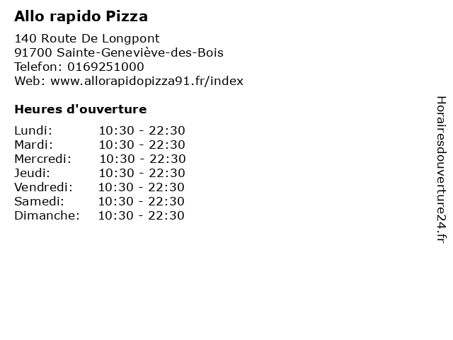 1 Allo Rapido Pizza (Distance: 19,64 km) 14-16 Rue Saint-Jacques, 77380 Combs La Ville allo, boissons, livraison, menus, pizza, pizzeria, rapido, restaurant 2 Speed Rabbit Pizza (Distance: 1,38 km) 7 Rue de Sainte-Geneviève, 91240 Saint-Michel-sur-Orge pizza, rabbit, speed 3 Pizza Brava (Distance: 1,76 km) 130 Avenue Gabriel Péri, 91700 Sainte-Geneviève-des-Bois brava, bueno, pizza, pizzeria, restaurant 4 Drag Fly Pizza (Distance: 2,15 km) 1 Rue Des Processions, 91240 St Michel Sur Orge drag, fly, pizza, restaurants 5 Domino's Pizza Villemoisson-sur-Orge (Distance: 2,51 km) 138 Route De Corbeil, 91360 Villemoisson-Sur-Orge domino's, orge, pizza, sur, villemoisson 6 Pizza Di Napoli (Distance: 3,72 km) 31 boulevard de la Gribelette, 91390 Morsang Sur Orge di, napoli, pizza, restaurants |