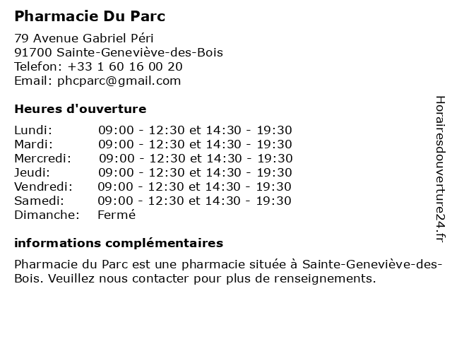 1 Pharmacie du Parc (Distance: 3,12 km) 28 rue de Savigny, 91390 Morsang Sur Orge du, homéopathie, médicaments, orthopédie, parapharmacie, parc, pharmacie 2 Pharmacie Du Parc (Distance: 15,63 km) 1 Place du Marché Neuf, 91190 Gif-sur-Yvette du, parc, pharmacie 3 Pharmacie du Parc (Distance: 18,24 km) 128 Avenue de la République, 92120 Montrouge du, geny, herboristerie, médicaments, paramédical, parapharmacie, parc, pharmacie, pharmacien, santé, traitements, vuarchex 4 Pharmacie du Parc (Distance: 18,25 km) 13 rue du Père Brottier, 92190 Meudon du, homéopathie, médicaments, orthopédie, parapharmacie, parc, pharmacie 6 Parc (Distance: 0,07 km) 4 Rue des Ecoles, 91700 Sainte-Geneviève-des-Bois caregivers houses, child care, family home, home care, kindergartens, micro-nurseries, parc, parental home |