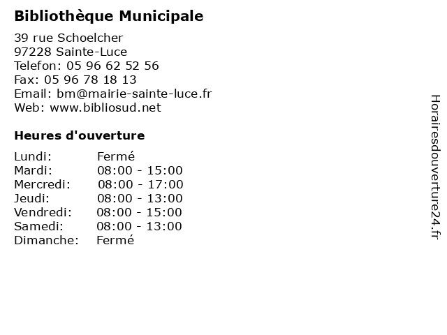 1 Bibliothèque Municipale (Distance: 2,44 km) - Boulevard Septembre 1870, 97211 Rivière-Pilote bibliotheque, bibliothèque, cd, dvd, livres, municipale, revues 2 Bibliothèque Municipale (Distance: 5,60 km) - rue Mano Germé, 97227 Sainte-Anne bibliotheque, bibliothèque, cd, dvd, livres, municipale, revues 3 Bibliothèque Municipale (Distance: 10,66 km) - rue Principale, 97223 Le Diamant bibliotheque, bibliothèque, cd, dvd, livres, municipale, revues 4 Bibliothèque Municipale (Distance: 12,39 km) 6 rue de la République, 97280 Le Vauclin bibliotheque, bibliothèque, cd, dvd, livres, municipale, revues 5 Bibliothèque Municipale (Distance: 16,39 km) 4 rue Homère Clément, 97240 Le François bibliotheque, bibliothèque, cd, dvd, livres, municipale, revues 6 Bibliothèque Anca Bertrand (Distance: 5,50 km) - rue Osman Duquesnay, 97290 Le Marin anca, bertrand, bibliotheque, bibliothèque, cd, dvd, livres, revues |