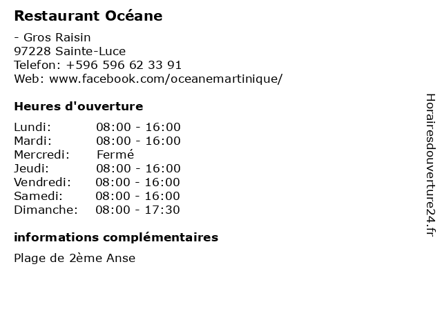 1 Pura Vida Restaurant (Distance: 0,79 km) . Gros Raisin, 97228 Sainte Luce creation, dessert, emporter, entrees, horaires, plats, pura, reservation, restaurant, terrasse, vida 2 Le Mabouya (Distance: 3,35 km) . Anse Mabouya, 97228 Sainte Luce creation, dessert, emporter, entrees, horaires, le, mabouya, plats, reservation, restaurant, terrasse 3 Otantik Ti Resto Nature (Distance: 8,64 km) . Rue Frantz Fanon, 97227 Sainte-Anne creation, dessert, emporter, entrees, exotique, horaires, nature, otantik, plats, reservation, restaurant, resto, terrasse, ti 4 École maternelle publique Volga Plage (Distance: 20,62 km) . Rue de la Tannerie, 97200 Fort-de-France cours, education, maternelle, plage, publique, services, volga, École, école 5 Brasserie du Théâtre (Distance: 21,95 km) 67 rue Victor Sévère, 97200 Fort-de-France brasserie, du, restaurant, restauration, terrasse, theatre, théâtre 6 Résidence Océane (Distance: 29,59 km) . Anss Bonneville, 97220 Trinité hebergement, hotel, océane, piscine, résidence |