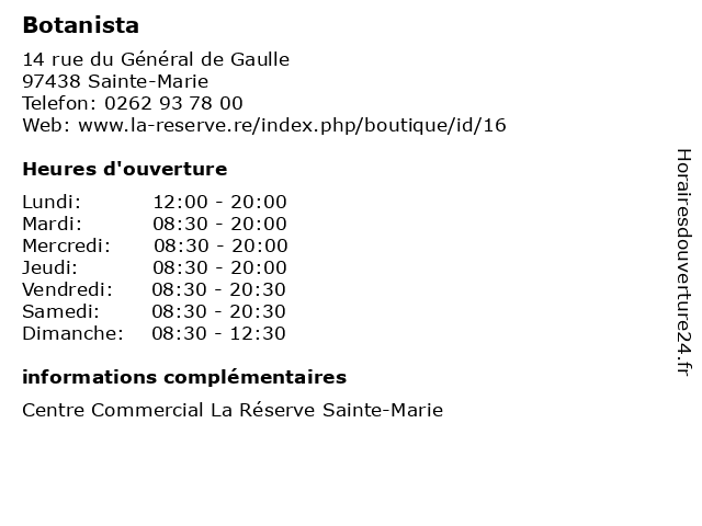 1 Botanista (Distance: 11,84 km) 14 rue du Général de Gaulle, 97438 Sainte-Marie animalerie, botanista, fleurs, jardinerie, plantes 2 Lenceria Lingerie (Distance: 0,00 km) 14 rue du Général de Gaulle, 97438 Sainte-Marie boutique, commerce, et, féminine, lenceria, lingerie, lingeries, masculine, vente 3 Levi's (Distance: 0,00 km) 14 rue du Général de Gaulle, 97438 Sainte-Marie boutique, commerce, levi's, levis's, prêt-à-porter, vente 4 Ptit Piment (Distance: 0,00 km) 14 rue du Général de Gaulle, 97438 Sainte-Marie boutique, commerce, levis's, piment, prêt-à-porter, ptit, vente 5 Brazilian Shoes (Distance: 0,00 km) 14 rue du Général de Gaulle, 97438 Sainte-Marie boutique, brazilian, chaussure, chaussures, commerce, shoes, vente 6 S2 (Distance: 0,00 km) 14 rue du Général de Gaulle, 97438 Sainte-Marie boutique, chaussure, chaussures, commerce, s2, vente |