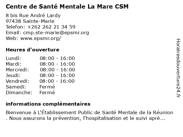 Termes de recherche pour Centre de Santé Mentale La Mare CSM:la, de, centre, santé, mare, mentale, csm |